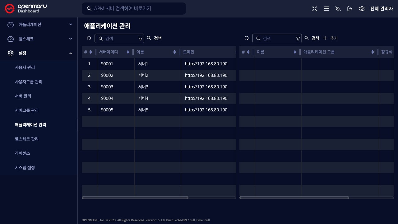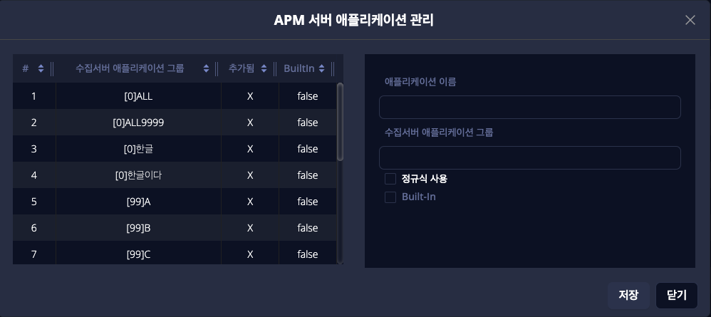 OPENMARU DashboardDashboard 설정가이드애플리케이션 관리이 페이지에서애플리케이션 관리 서버관리에 등록한 서버에 애플리케이션을 등록하고 관리하는 기능을 제공합니다. 애플리케이션 추가 APM 서버 애플리케이션 관리는 APM 서버에 애플리케이션을 등록 및 삭제가 가능하다. 애플리케이션 이름을 지정할 수 있다. BuiltIn이 true인 경우에만 애플리케이션에서 정규식을 사용 가능하다. 정규식 사용을 체크한 후 APM서버 애플리케이션 그륩에서 정규식을 입력할 수 있다.