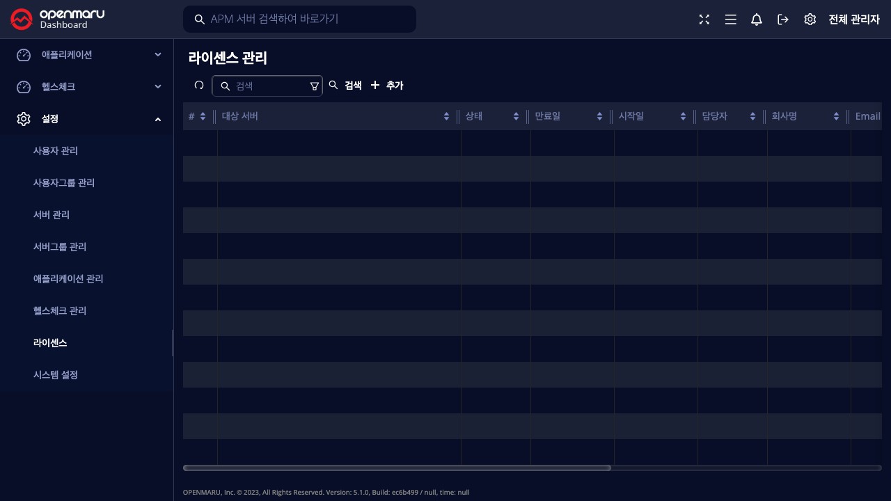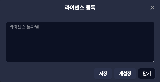 OPENMARU DashboardDashboard 설정가이드라이센스 관리이 페이지에서라이센스 관리 오픈마루 대시보드의 라이센스를 등록하고 관리하는 기능을 제공합니다. 라이센스 관리란? 대시보드 라이센스를 등록하고 삭제할 수 있는 관리 페이지이다. 라이센스 등록 추가 버튼을 클릭하면 라이센스를 등록이 가능하다.