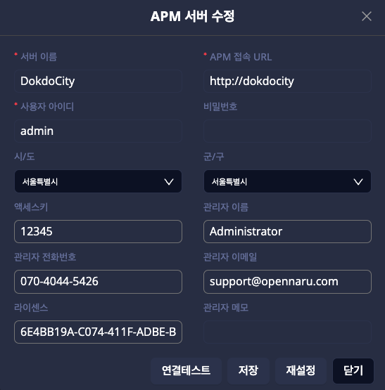 다음은 APM 서버 수정에 입력 가능한 항목이다.