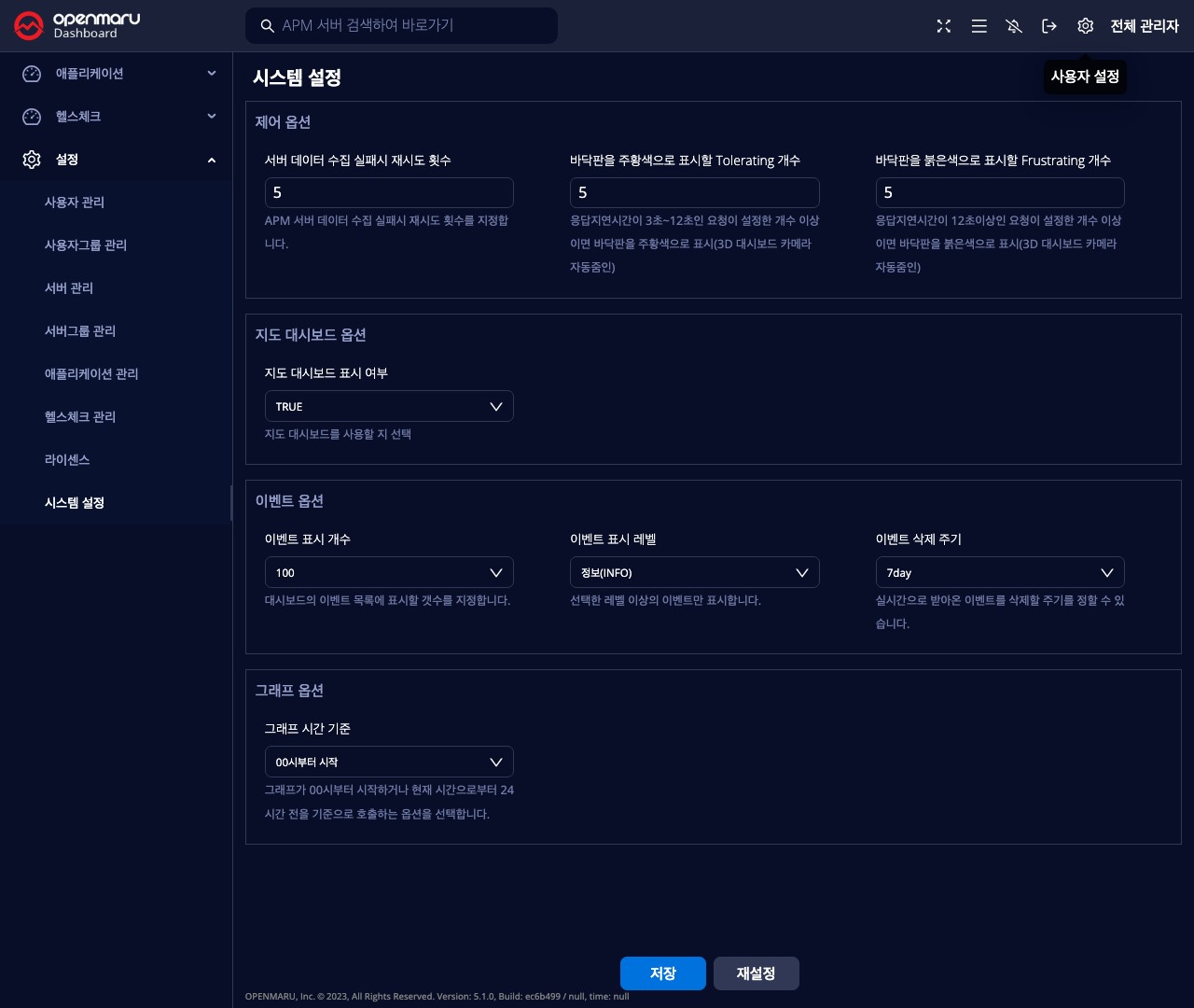 오픈마루 대시보드의 주요 기능을 설정할 수 있습니다.