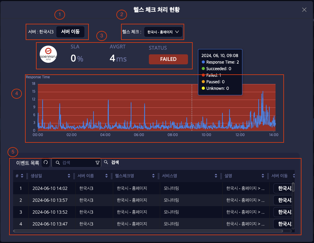 대시보드의 우측 하단의 “이벤트 목록” 버튼을 클릭하여 확인 할 수 있으며, OPENMARU APM 서버에서 발생한 헬스체크 관련 이벤트를 목록으로 확인 할 수 있습니다.