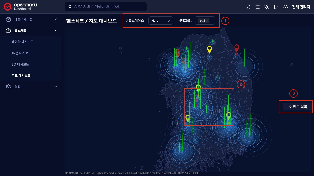 OPENMARU Dashboard헬스체크 Dashboard 지도 대시보드이 페이지에서지도 대시보드 전국에 애플리케이션 서버들이 운영되고 있다면, 지도위에 그 위치를 표시하고 애플리케이션 응답 현황을 한눈에 파악할 수 있습니다. 응답현황이 기둥으로 표시되며, 애플리케이션 응답 에러가 발생하면 에러 마커(Error Marker)가 표시되어 확인할 수 있습니다. 기둥을 클릭하면 바로 APM 수집서버로 이동하여 에러(장애)의 원인을 확인할 수 있습니다. 지도 대시보드 화면구성 ① 필터 워크스페이스, 서버그룹 별로 필터링하여 모니터링할 수 있습니다. 팁워크스페이스, 서버그룹, 서버 설정방법은 링크 문서 참조 ② 지역별 기둥