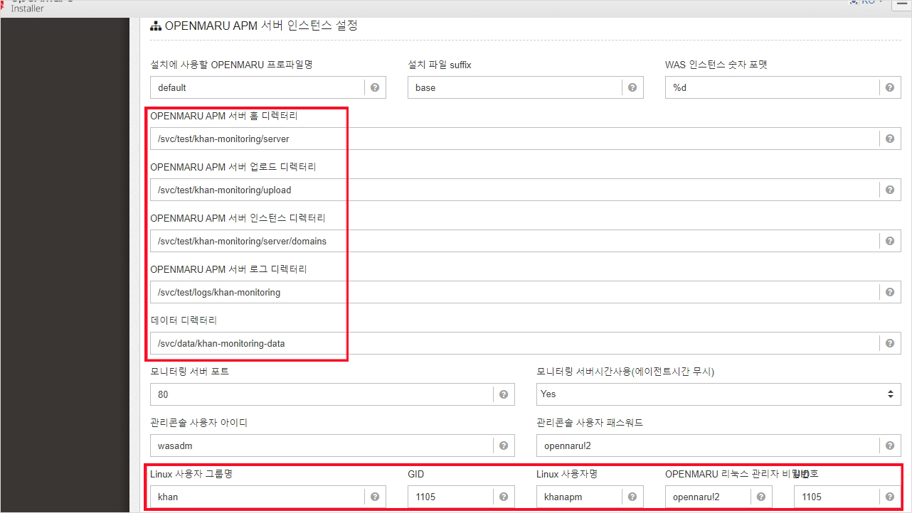 - APM 서버 홈 디렉토리 : Linux 사용자 계정의 HOME 디렉토리 - APM 서버 업로드 디렉토리 : 설치에 필요한 임시 파일들이 업로드 된다. - 데이터 디렉토리 : 수집서버가 사용하는 Database의 데이터가 저장된다. - 모니터링 서버 포트 : 브라우저로 서비스할 포트를 설정한다.(이중화된 서버 인스턴스를 로드발란싱) - Linux 사용자 그룹명(GID) : APM 수집서버를 관리할 Linux 사용자 그룹 - Linux 사용자명(UID) : APM 수집서버를 관리할 Linux 사용자