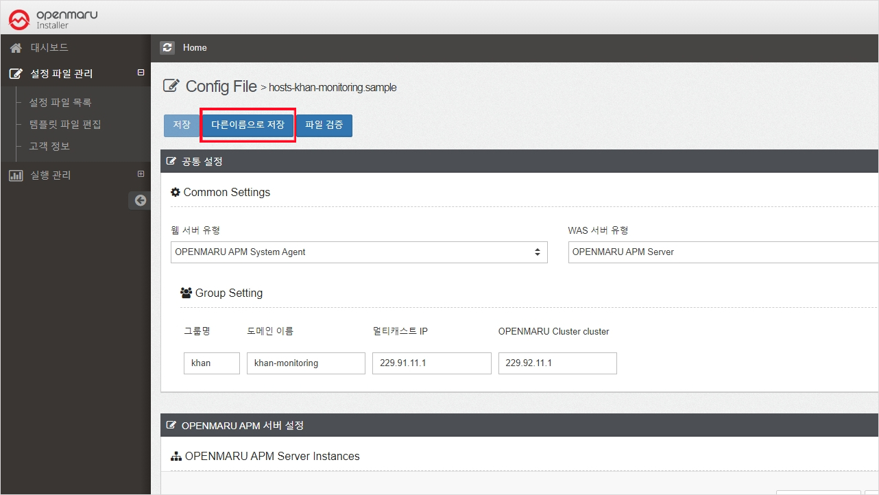 OPENMARU iAP Installer 가 설치된 서버에 접속 하여 설치 경로에서 APM 템플릿을 복사 및 설치 정보로 수정한다.