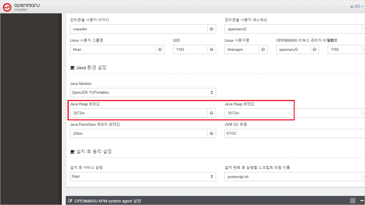 - Java Version : OpenJDK 타입 및 버전을 선택한다.(yum or Potable) - Java Heap 최소값/최대값 : 에이전트가 100개 이상이라면 4096m 권장)