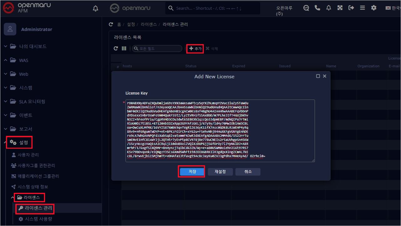 - 설정 -> 라이센스 -> 라이센스 관리 -> 추가 라이센스 키 값 복사 붙여넣기 후 저장