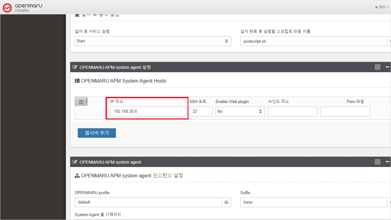 - 서버 추가 : System 에이전트를 설치할 서버를 추가한다. - IP 주소 : 설치 대상 APM