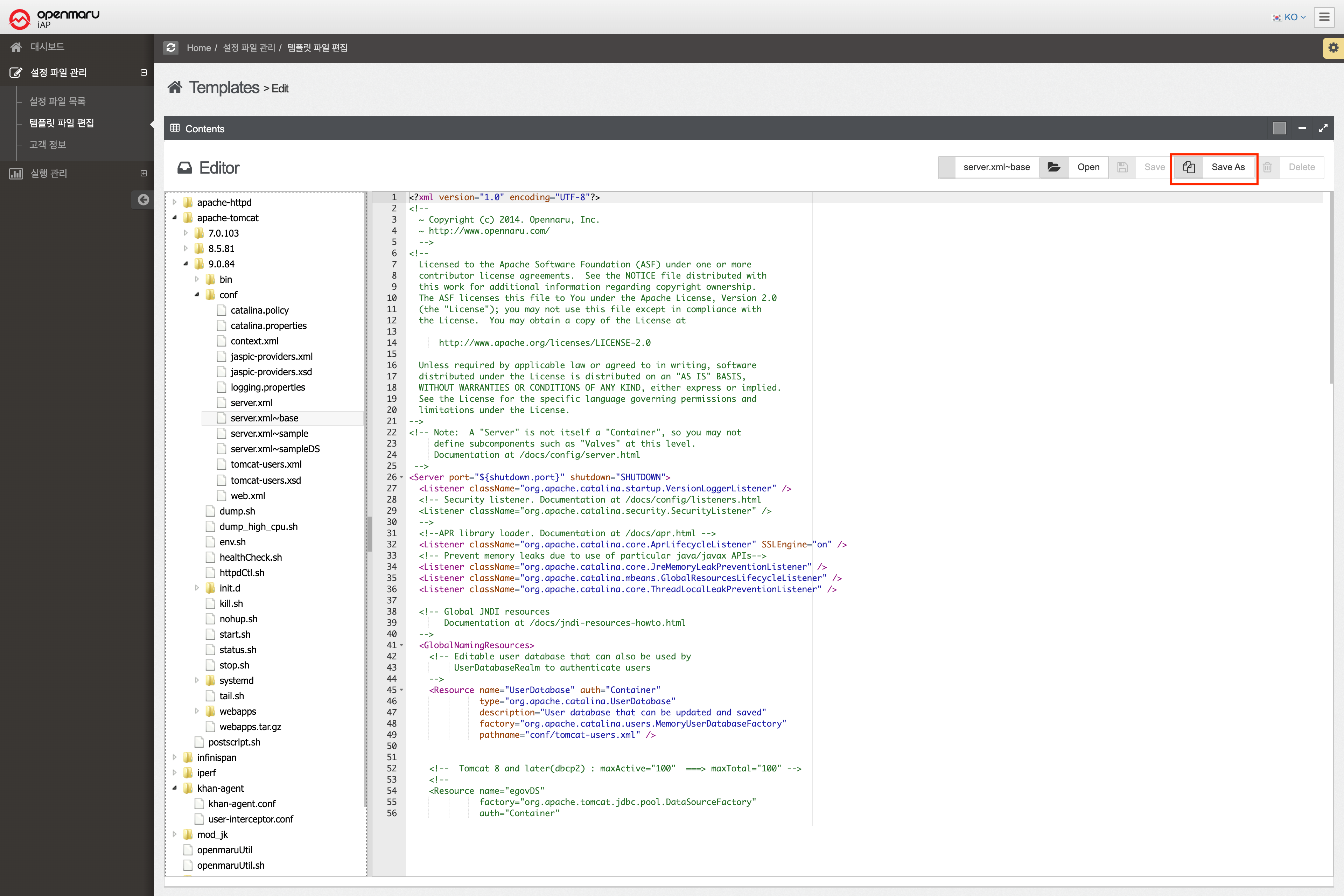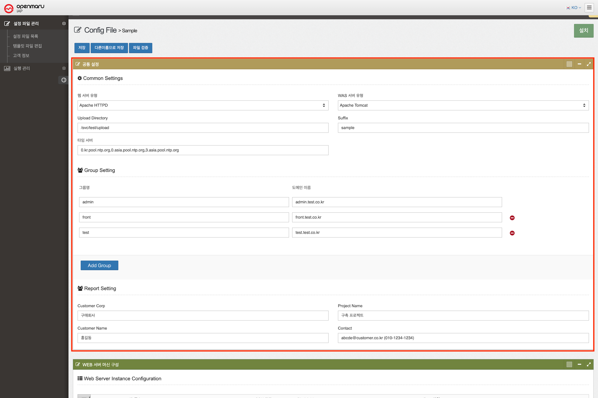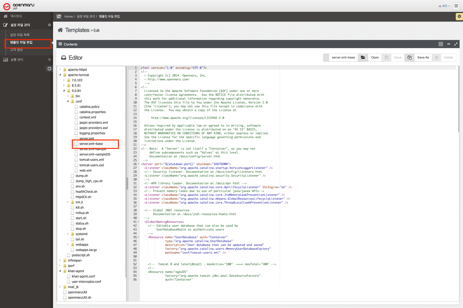 OPENMARU iAP의 설치에 사용되는 설정 파일의 템플릿을 사용자가 설치 환경에 맞게 설정 내용을 직접 변경할 수 있는 편집 기능을 제공한다.