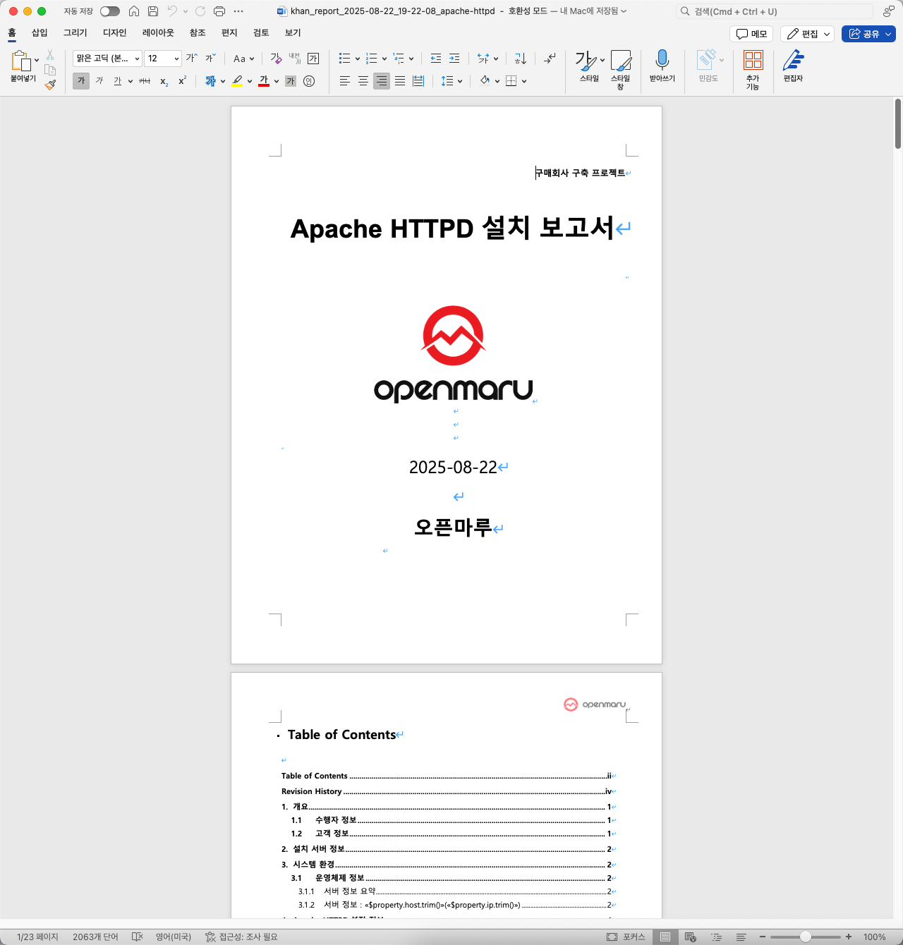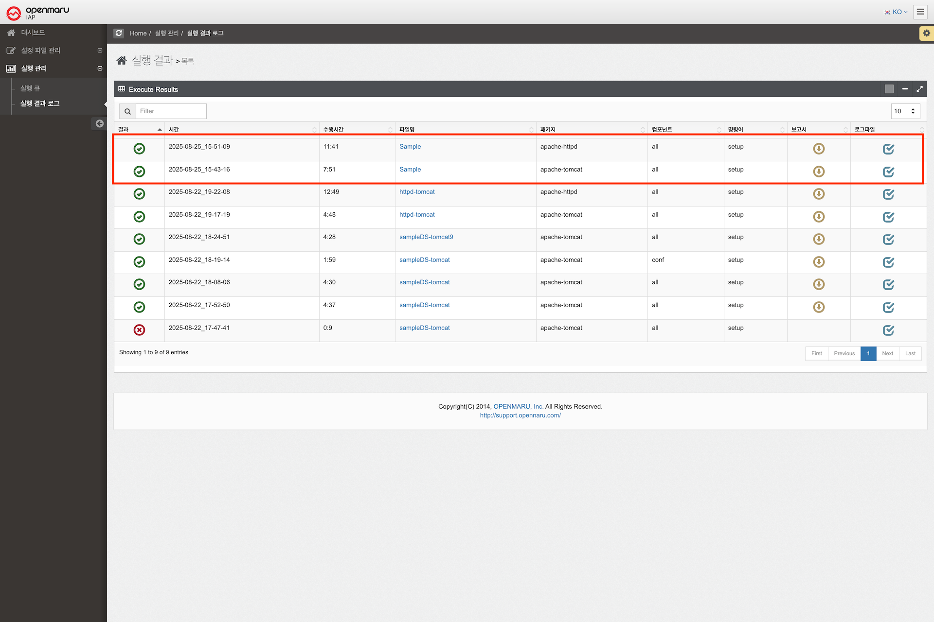 실행 결과 로그 창에는 OPENMARU Installer 이 작업을 수행하는데 걸린 시간, 수행 결과, 수행한 설정 파일 명 등의 정보를 제공하여 준다. 또 보고서 버튼을 클릭하면 고객 에게 제출할 수 있는 JBoss EAP, JBoss EWS제품 설치 보고서 문서가 자동으로 생성된다.