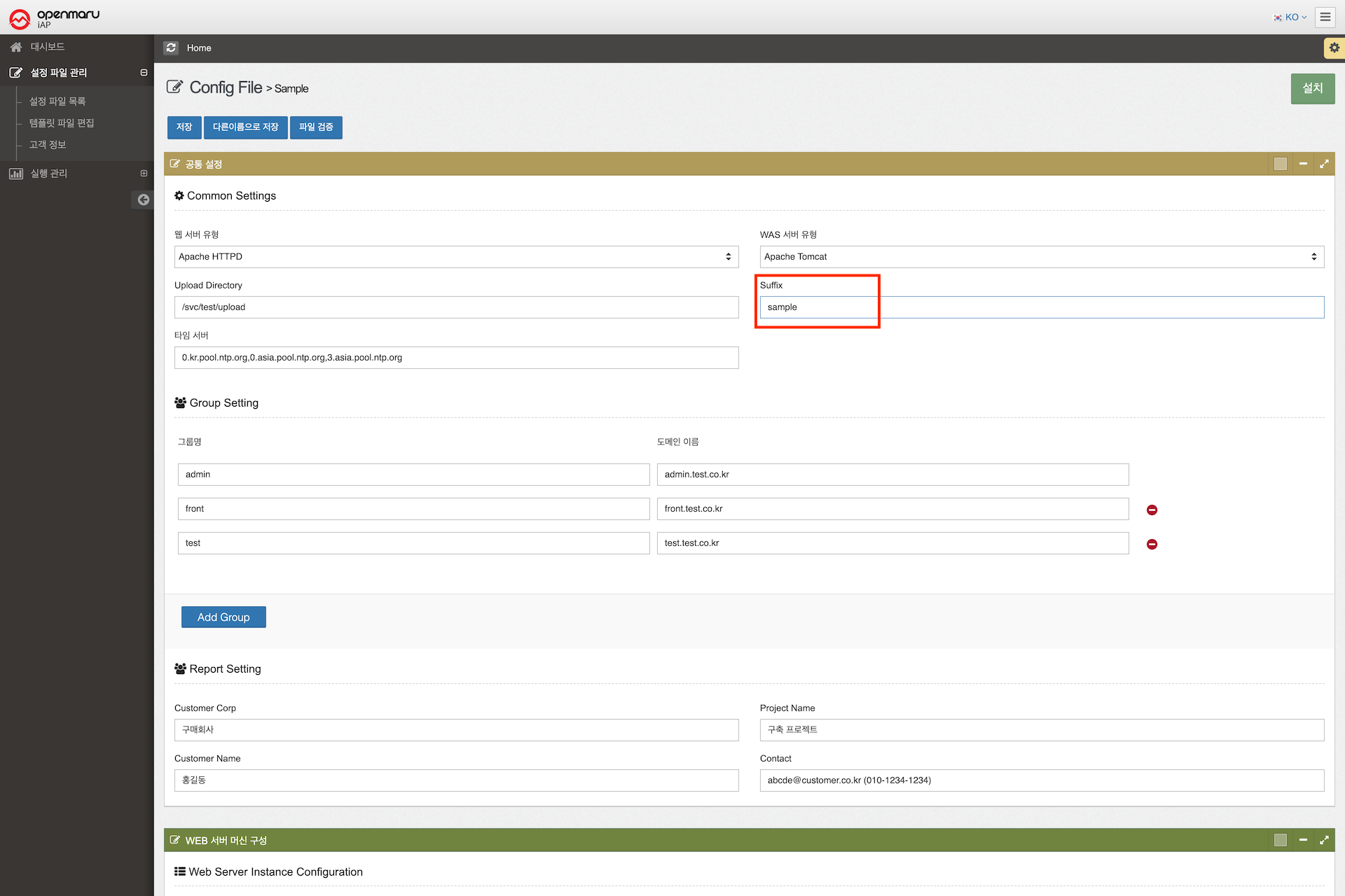 - 설정 목록에서 설치 파일 suffix 항목을 변경 한다. 입력값은 템플릿에서 사용자가 작성한 템플릿명 뒤의 접미사 부분을 입력한다. (