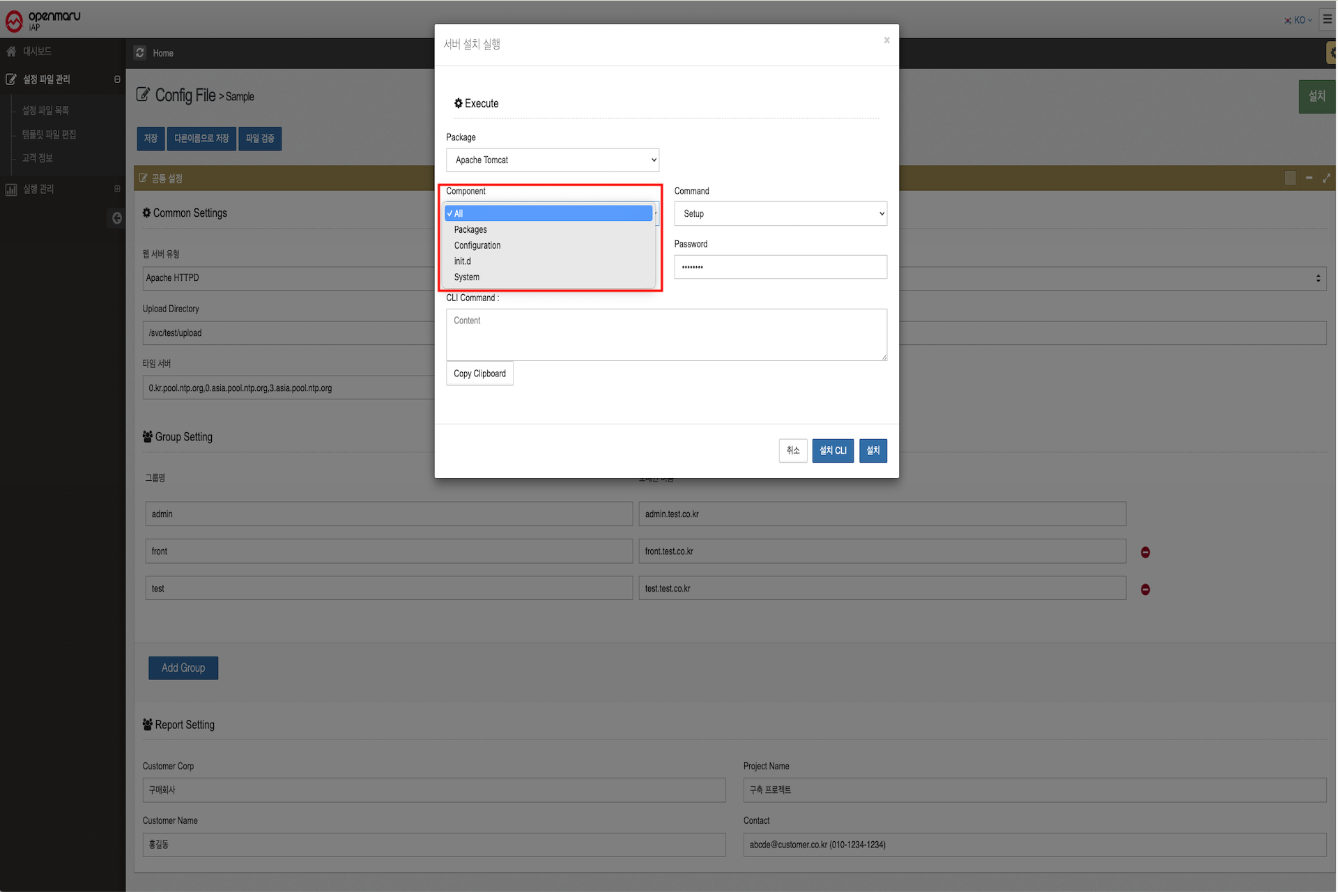 All은 전체 설치,Packages는 바이너리만,Configuration은 설정 파일만,Init.d는 서비스 스크립트만,System은 시스템 레벨 설정만 수행합니다. - Command: 실행할 작업을 선택합니다. 각 Command의 상세 동작은 다음과 같습니다: