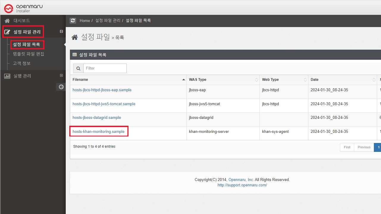 - 설정 파일 관리 -> 설정 파일 목록 -> hosts-khan-monitoring-sample 선택