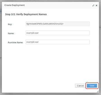 ‘Path’에는 압축이 풀린 디렉터리 경로를 입력한다. ‘Is Archive?’ 체크박스는 선택하지 않는다. example.war파일이 압축 파일인 경우에는 체크 박스를 선택한다. ‘Name’은 JBoss에서 관리에 사용하는 이름이며, ‘Runtime Name’은 실제 배포될 이름이다. 예제에서 example.war는 압축을 풀어놓은 디렉터리이다.