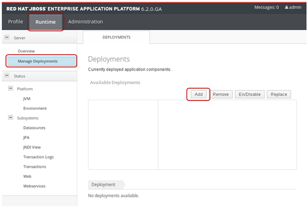 관리 콘솔에서 ‘Runtime’ ‘Server’ ‘Manage Deployments’를 선택한다.