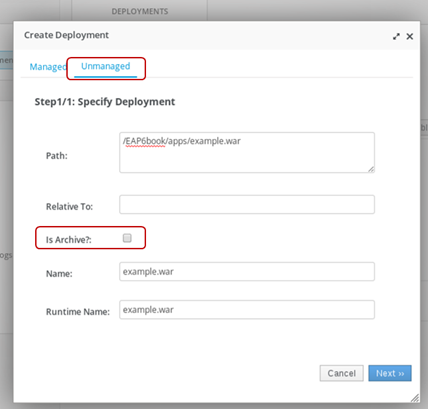 JBoss EAP 6 서버에 애플리케이션을 배포할 때 WAR나 EAR로 패키징된 하나의 파일을 사용하지 않고 별도의 디렉터리(Exploded)에 보관된 애플리케이션을 사용하려고 할 때 사용하는 방법이 Unmanaged 배포 방법이다. 대부분 미들웨어 벤더는 운영환경에서 JSP를 체크하여 컴파일하는 것을 권장하진 않지만, 특정 JSP 변경 파일만 빠르게 운영환경에 반영하려는 요구사항이 많다. 이 경우 압축이 풀린 디렉터리 형태로 배포하여야 한다. 이런 배포 방식을 JBoss에서는 Unmanaged 배포라고 한다.