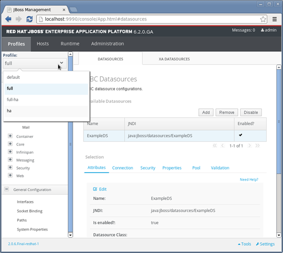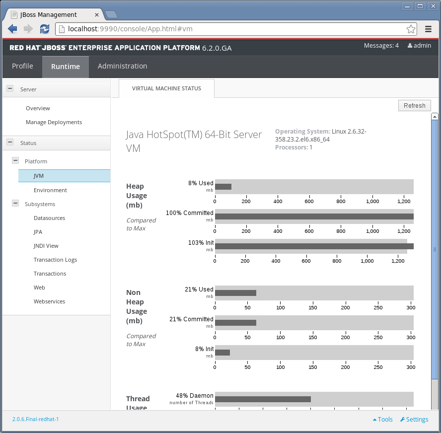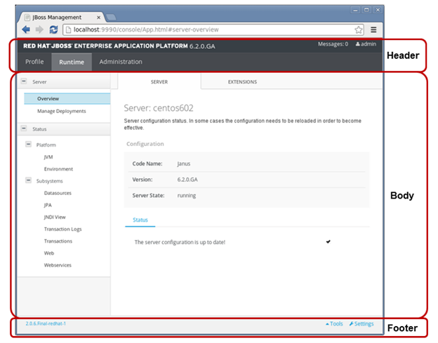 헤더의 우측으로 ‘Profile’과 ‘Runtime’의 탭이 있다. 인스턴스의 프로파일 관리와 런타임 정보 모니터링을 선택할 수 있다. 도메인 모드에서는 ‘Server’ 탭이 추가된다.