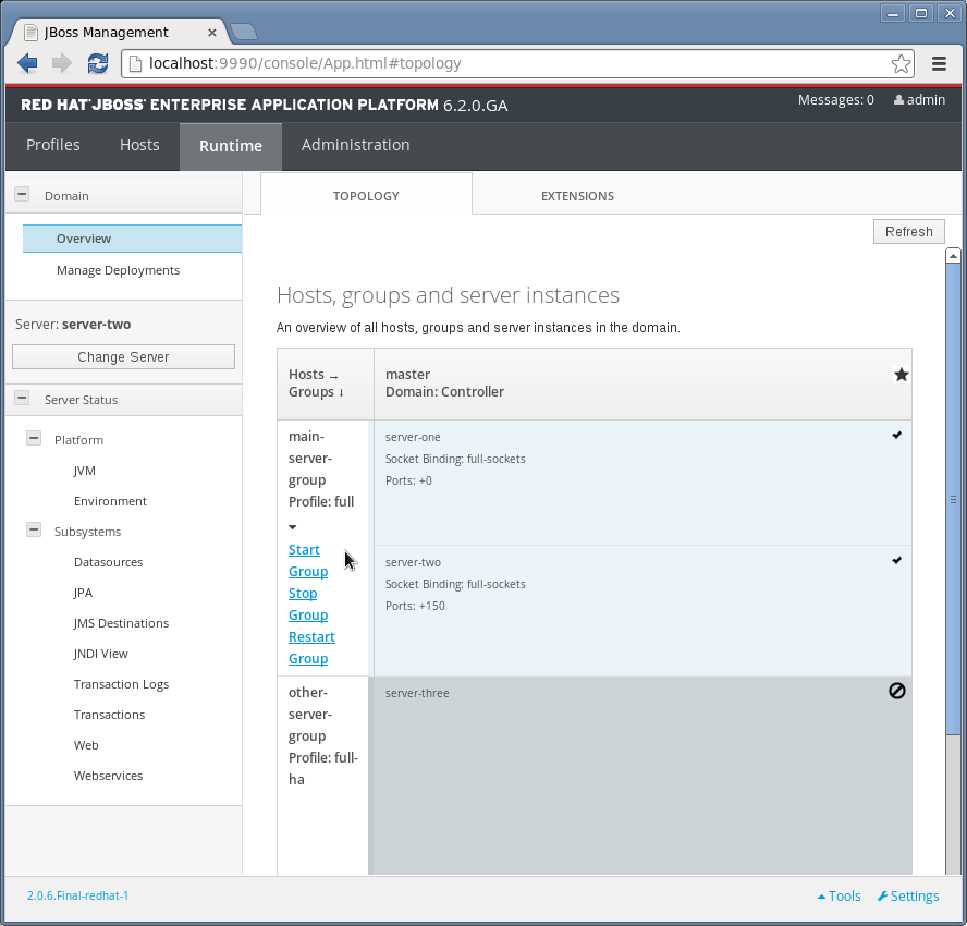 도메인 모드의 관리 콘솔로 접속하면 서버의 토폴로지가 테이블 형태로 표시된다. 다른 메뉴를 사용 중이면, Runtime Domain Overview 를 선택하면 아래 화면이 출력된다. 서버 그룹과 호스트 별로 설정된 서버 인스턴스들이 표시되고, 서버 그룹과 서버 인스턴스별 시작, 정지, 재시작 등의 제어가 가능하다.