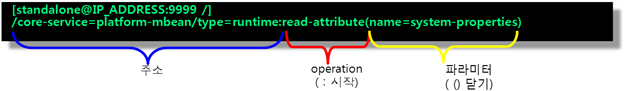 위의 DMR 모델 구조를 살펴 보면, JBoss에서 운영 모니터링에서 조작할 수 있는 관리 리소스를 주소로 지정하여 해당 주소의 리소스에 대해서 관리 명령을 실행한다. : 다음에 오퍼레이션을 지정한다. 어떤 리소스인지 ‘주소’에 따라 사용 가능한 오퍼레이션이 다르다. 또 오퍼레이션 실행 시 넘겨줄 파라미터 값들을 오 퍼레이션 다음의 괄호 안에 컴마로 구분한 name=value 형태로 지정하여 해당 리소스에 대해 오퍼레이션을 실행한다.