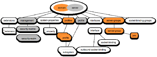 JBoss EAP 6의 구축 및 설정 시, 특히 관리 CLI를 사용하는 경우엔 관리 자원이 어떤 형태의 트리로 구성되는지 파악해야 한다. 기본적으로 스탠드얼론 모드에서는 standalone.xml등의 설정 파일의 schema에 따라 트리가 구성되지만, 도메인 구성에서는 도메인 모델에 맞는 트리가 구성된다.