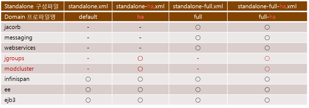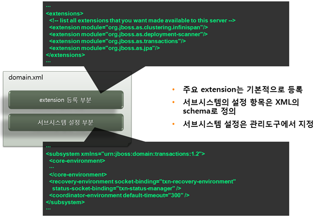 JBoss EAP 6에서는 어느 모듈을 이용하는지를 선택할 수 있어, 사용자가 이용하고 싶은 기능을 선택할 수 있다. 미리 준비되어 있는 각 프로파일에는 어떤 기능, 즉 어떤 모듈을 사용할 것인지가 설정 파일(standalone.xml, domain.xml 등)에 정의되었다. 일반적으로JBoss EAP의 설정은 관리 콘솔이나 CLI등의 관리 UI를 통해서 수행되지만, 그 내용도 설정 파일(standalone.xml, host.xml등)에 저장된다. 여기에서 설정 파일을 구성하는 XML 엘리먼트들을 기본적인 설정의 컨셉에 따라서 설명한다. 설정 파일의 주요한 설정 항목은 아래와 같다.