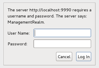 관리 콘솔을 이용하려면, JBoss EAP 6가 시작되어 있어야 한다. 웹 브라우저로 아래와 같은 URL에 접근하면 관리 콘솔의 인증 화면이 표시된다. JBoss EAP 6 관리자 아이디와 패스워드를 입력하여 로그인한다.