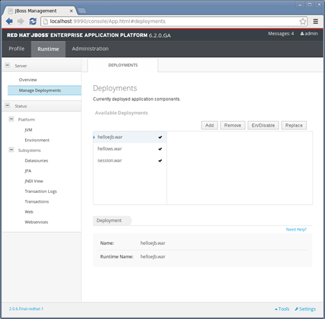 네비게이션 패널(좌측의 프레임)에는 JBoss EAP 6 인스턴스에 배포되고 있는 각종의 자원을 트리로 표시한다.
