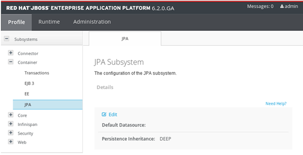 JBoss EAP의 JPA 서브 시스템 설정은 persistence.xml 파일에서 데이터소스를 설정하지 않았을 경우에 기본값으로 사용할 수 있도록 기본 데이터소스를 설정하는 것이 있다. 기본값은 설정되어 있지 않다.