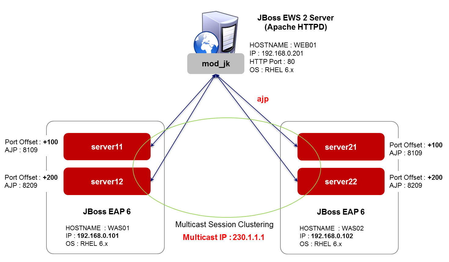 아래 그림과 같이 웹 서버와 JBoss EAP 6 서버 인스턴스를 구성한다고 가정하자.