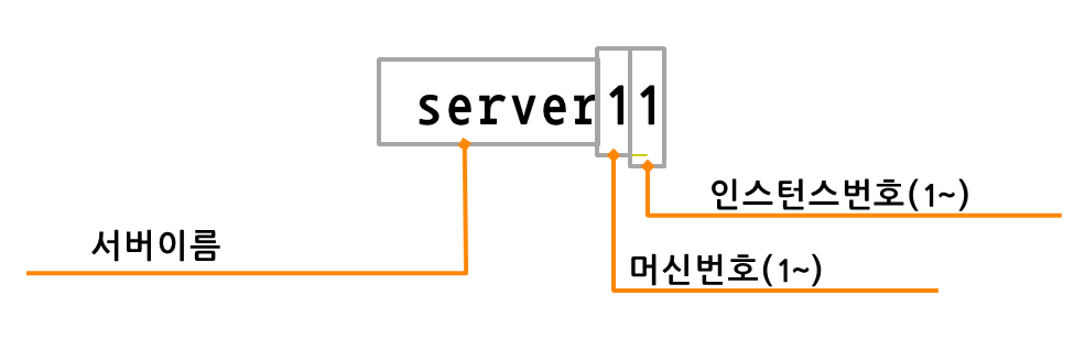 실제 서버의 이름은 서비스를 나타내는 고유명칭으로 변경하여 사용하면 된다. 머신 번호는 JBoss에 사용할 머신에 1번부터 차례대로 붙인 번호를 사용하고, 인스턴스 번호는 같은 머신 내의 인스턴스 개수를 1번부터 번호를 붙인다.