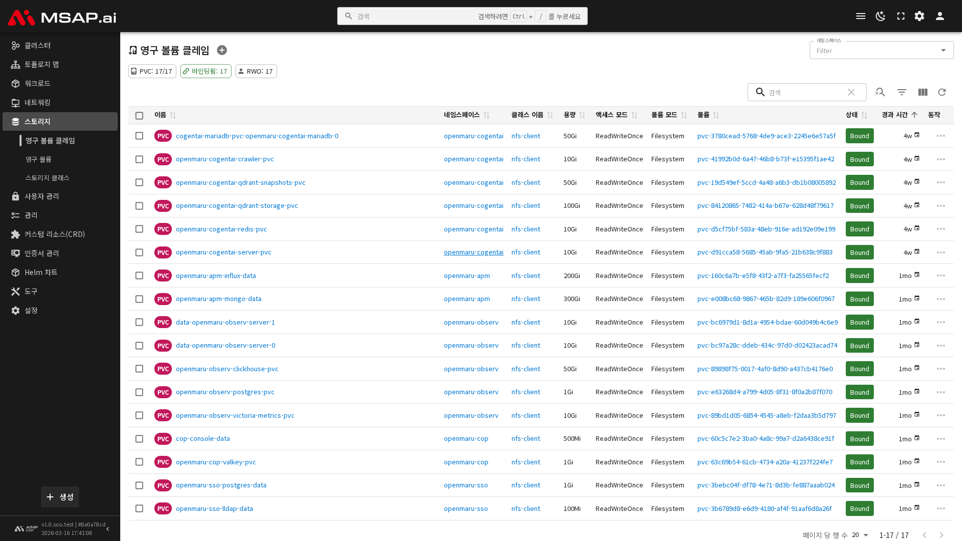 사이드바에서 스토리지 > 영구 볼륨 클레임을 선택하면 현재 네임스페이스의 PVC 목록이 표시됩니다. 목록에서는 다음 정보를 확인할 수 있습니다.
