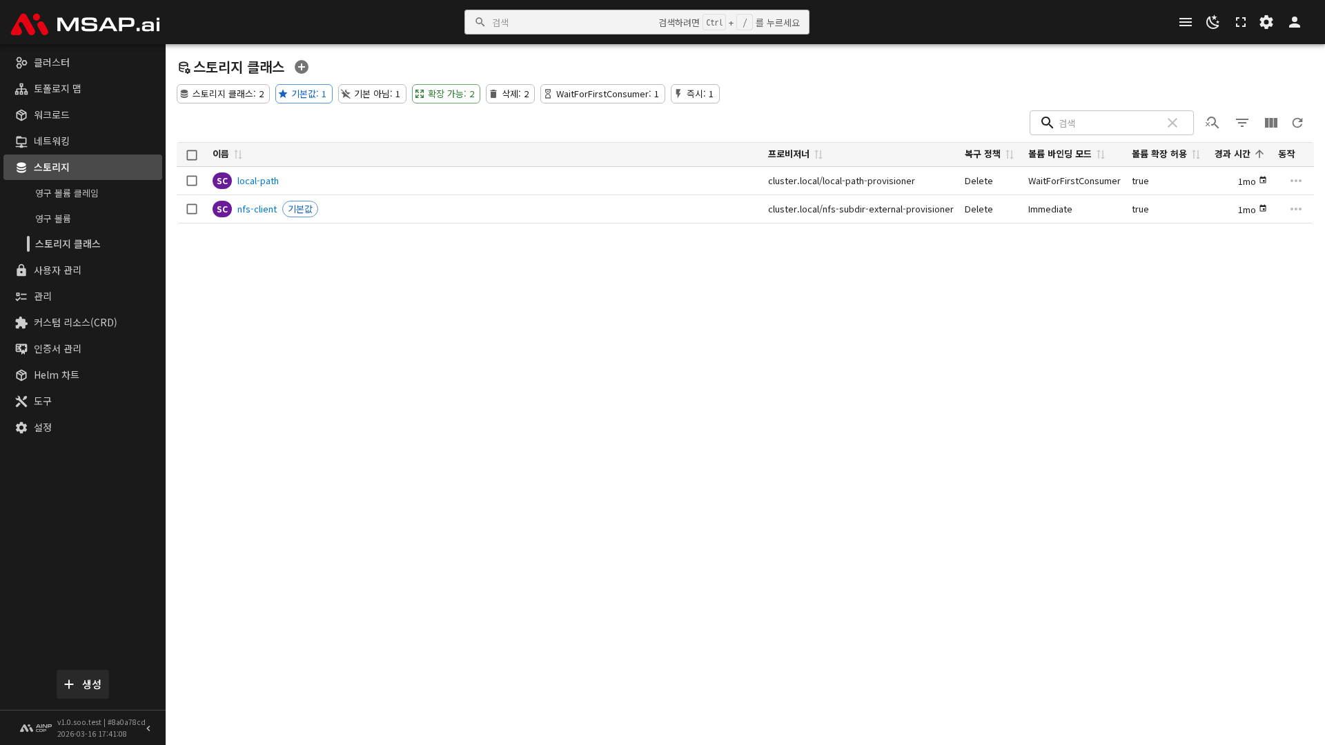 목록에서는 각 스토리지 클래스의 이름, 프로비저너, 회수 정책, 볼륨 바인딩 모드, 기본 여부를 확인할 수 있습니다. 기본 스토리지 클래스는 PVC에서 스토리지 클래스를 명시하지 않을 때 자동으로 적용됩니다.
