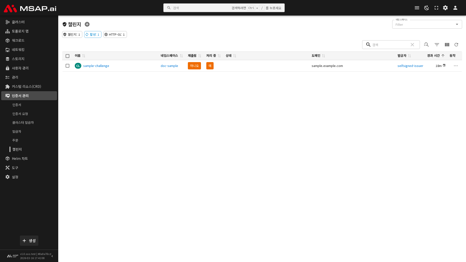 사이드바에서 인증서 관리 > Challenge를 선택하면 현재 클러스터에 존재하는 Challenge 목록이 표시됩니다. 목록에서는 다음 정보를 확인할 수 있습니다.