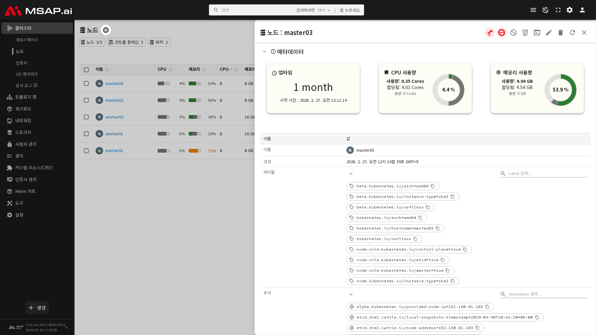 노드 목록 화면에서는 클러스터에 속한 모든 노드의 현황을 한눈에 확인할 수 있습니다.
