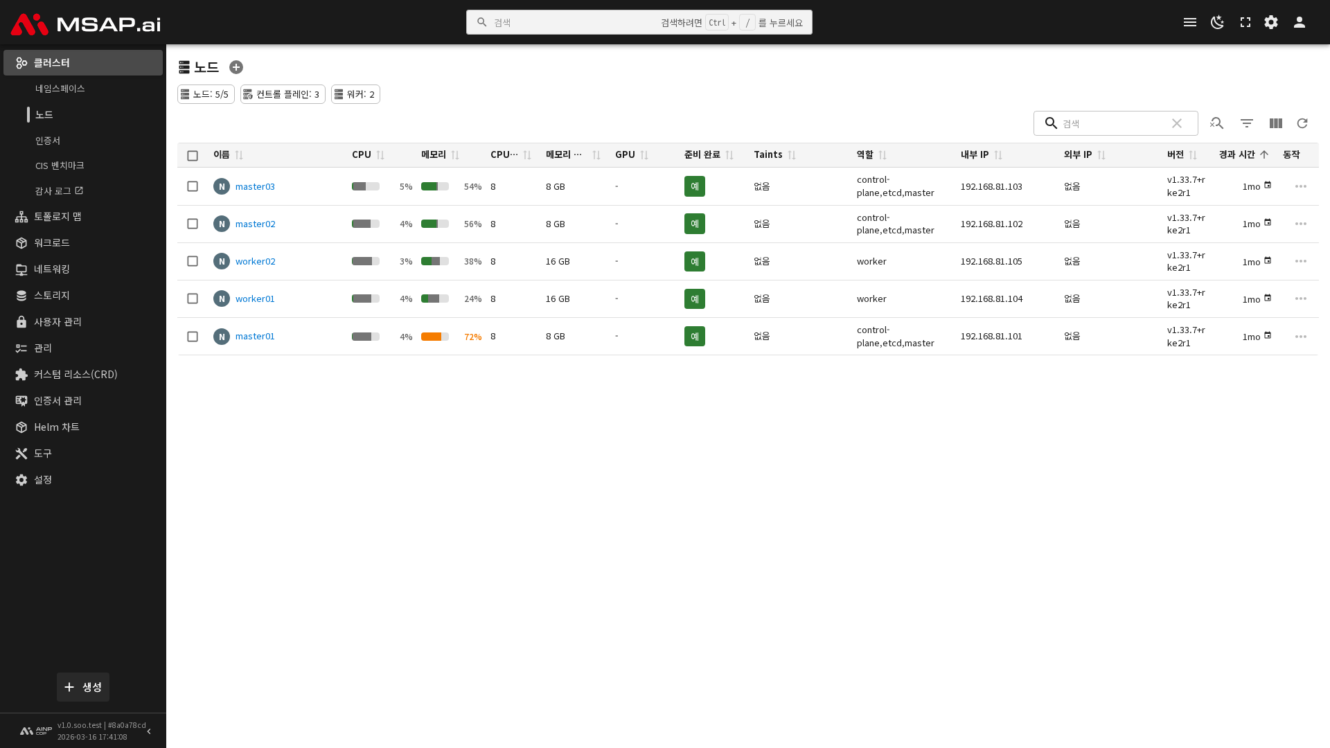 MSAP.ai Console의 노드 관리 기능을 사용하면 Kubernetes 클러스터를 구성하는 노드의 상태를 확인하고, 유지보수 작업을 수행할 수 있습니다. 사이드바에서 클러스터 > 노드를 선택하여 접근합니다.