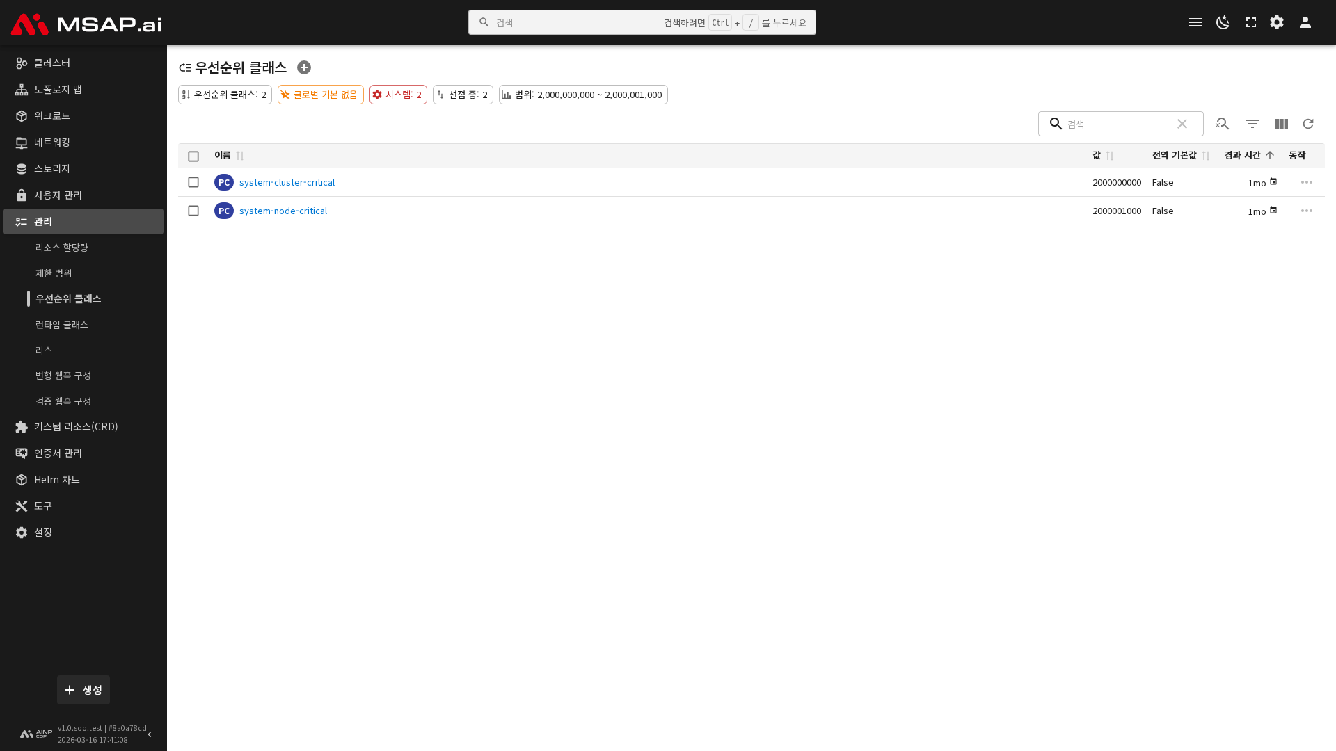 목록에서는 각 우선순위 클래스의 이름, 값(Value), 전역 기본(Global Default) 여부를 확인할 수 있습니다.