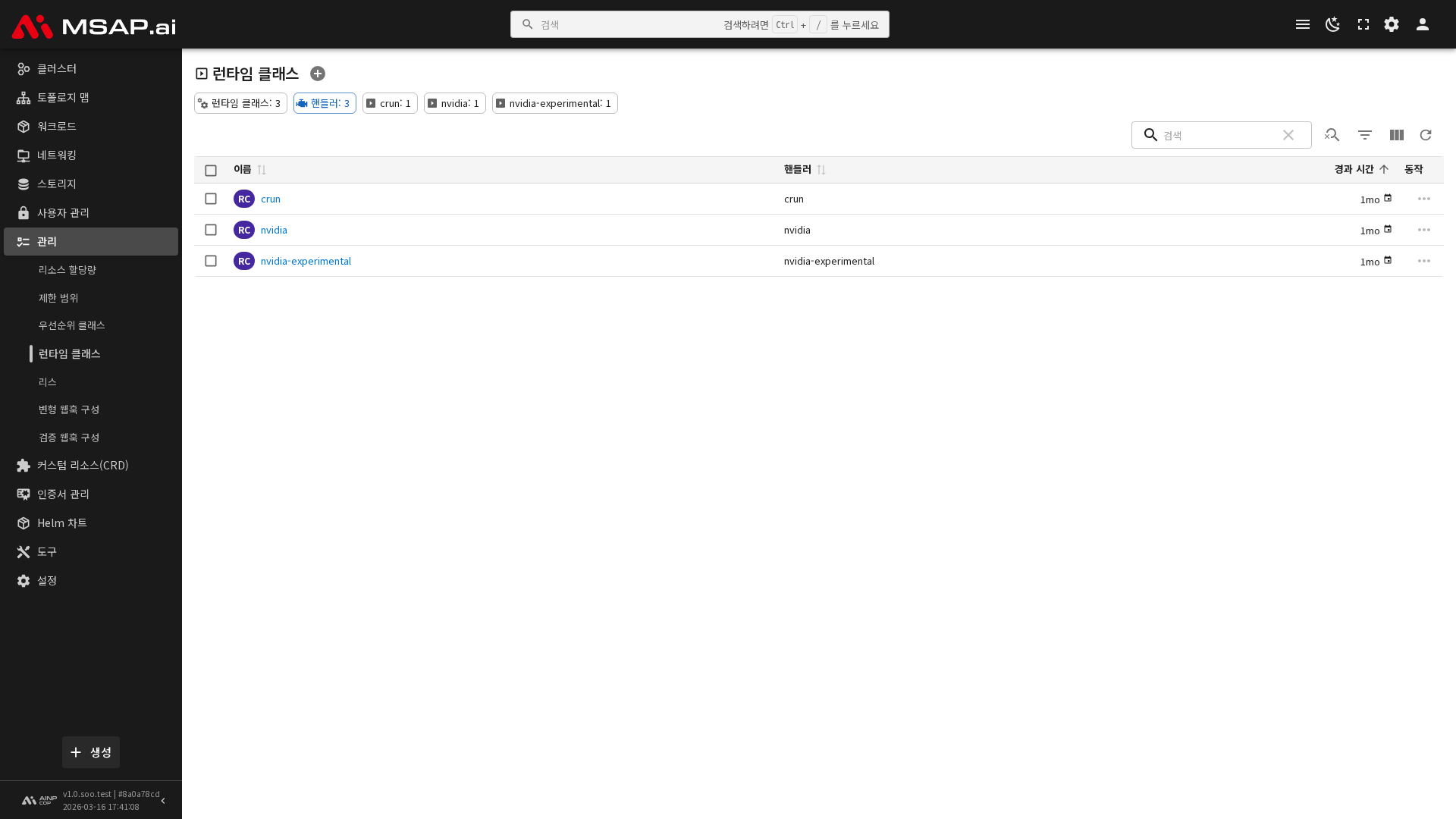 - 핸들러(Handler): 이 런타임 클래스를 사용할 때 호출되는 CRI(Container Runtime Interface) 런타임 핸들러 이름입니다.