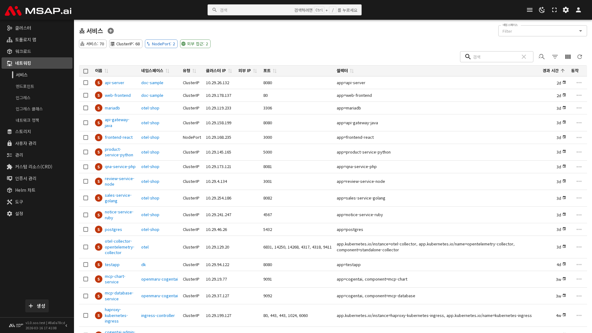 사이드바에서 네트워크 > 서비스를 선택하면 현재 네임스페이스에 존재하는 서비스 목록이 표시됩니다. 목록에서는 다음 정보를 확인할 수 있습니다.