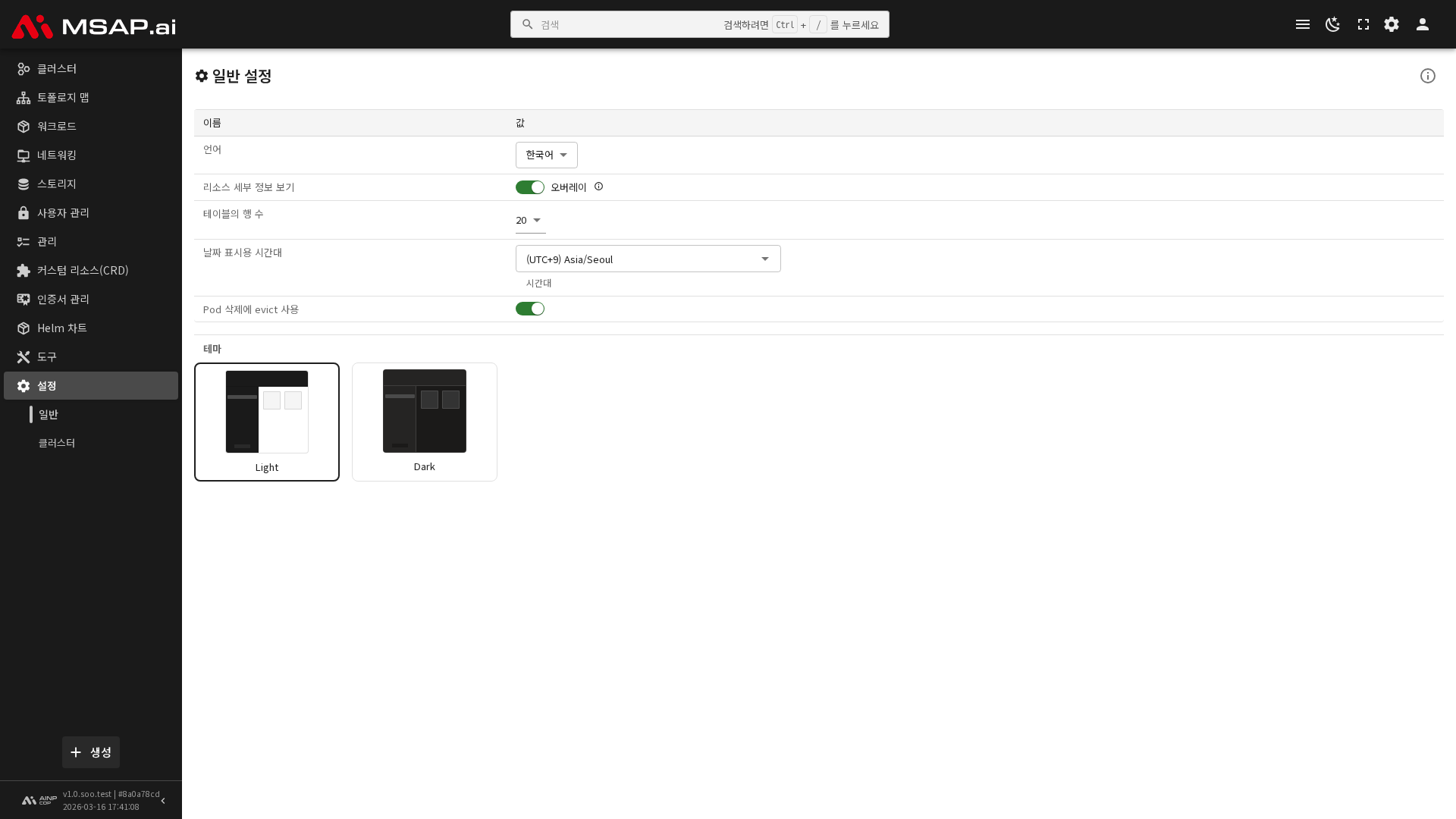 테마를 변경하면 콘솔 전체의 색상, 배경, 아이콘 스타일이 즉시 전환됩니다. YAML 편집기의 구문 하이라이팅 색상도 선택된 테마에 맞게 자동으로 조정됩니다.