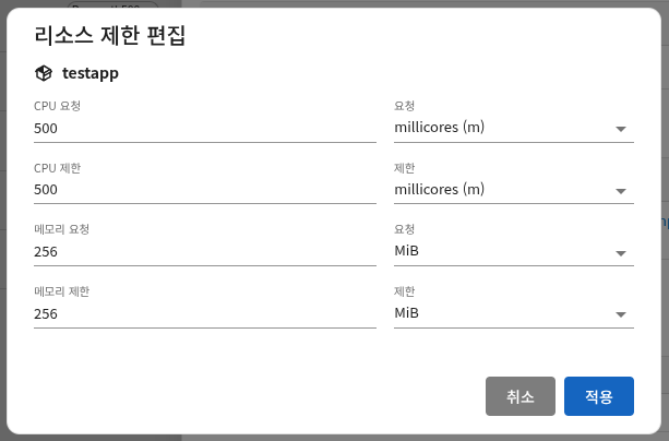 동작 메뉴의 편집 또는 상세 화면에서 컨테이너의 CPU 및 메모리 리소스 요청(Request)과 제한(Limit)을 설정할 수 있습니다.