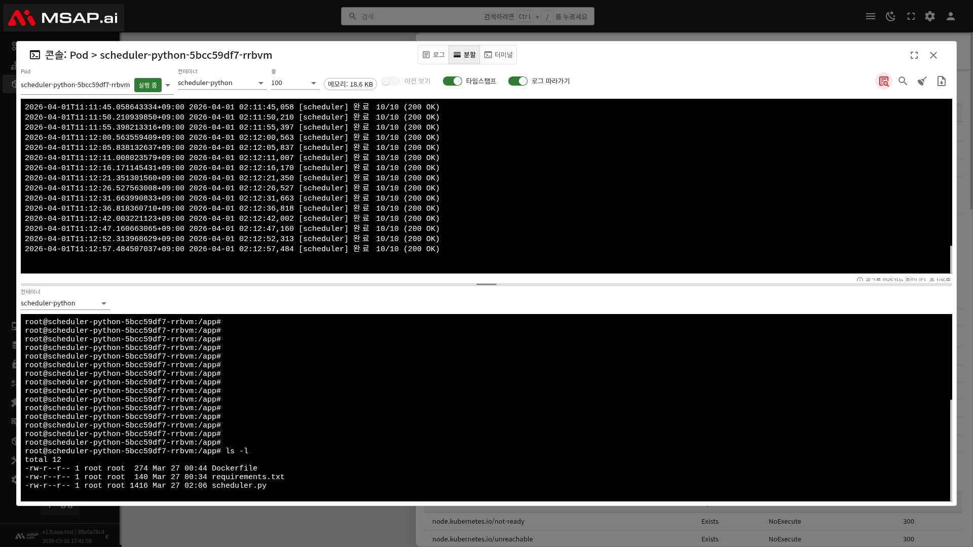 배포 상세 화면에서 파드의 로그 조회와 터미널 접속을 동시에 활용할 수 있습니다. 로그와 터미널을 각각 단독으로 볼 수도 있고, 화면을 분할하여 함께 확인할 수도 있습니다.