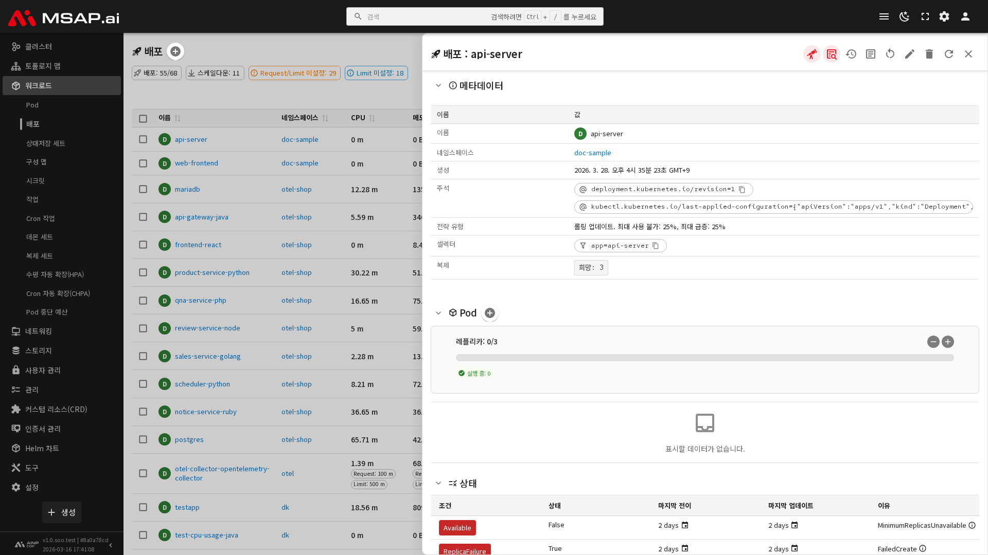 배포가 관리하는 ReplicaSet, Pod 등 관련 리소스의 목록을 확인하고 각 리소스의 상세 화면으로 이동할 수 있습니다.