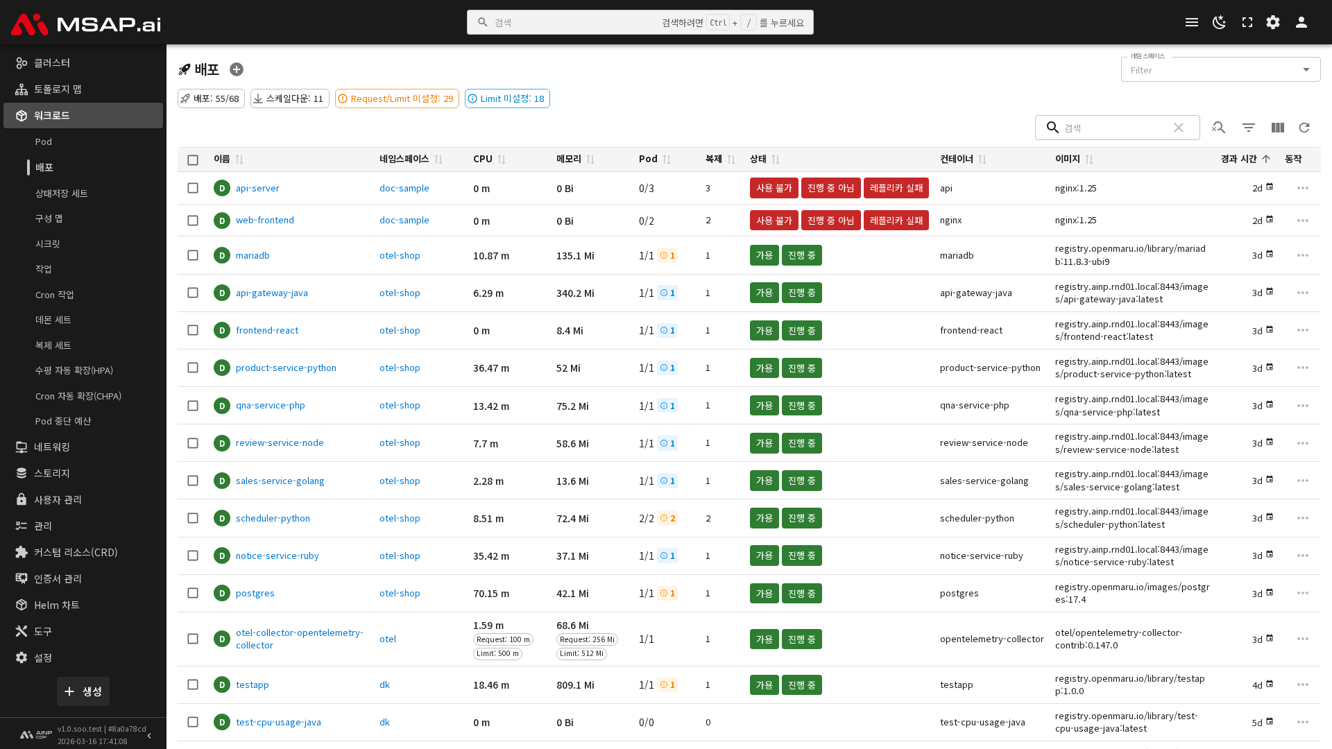 MSAP.ai 콘솔의 '배포(Deployment)' 메뉴에서는 파드(Pod)와 복제 세트(ReplicaSet)에 대한 선언적 업데이트를 제공하는 워크로드를 관리합니다. 배포는 무상태(stateless) 애플리케이션의 롤링 업데이트, 롤백, 스케일링 등을 관리하는 데 가장 일반적으로 사용됩니다.
