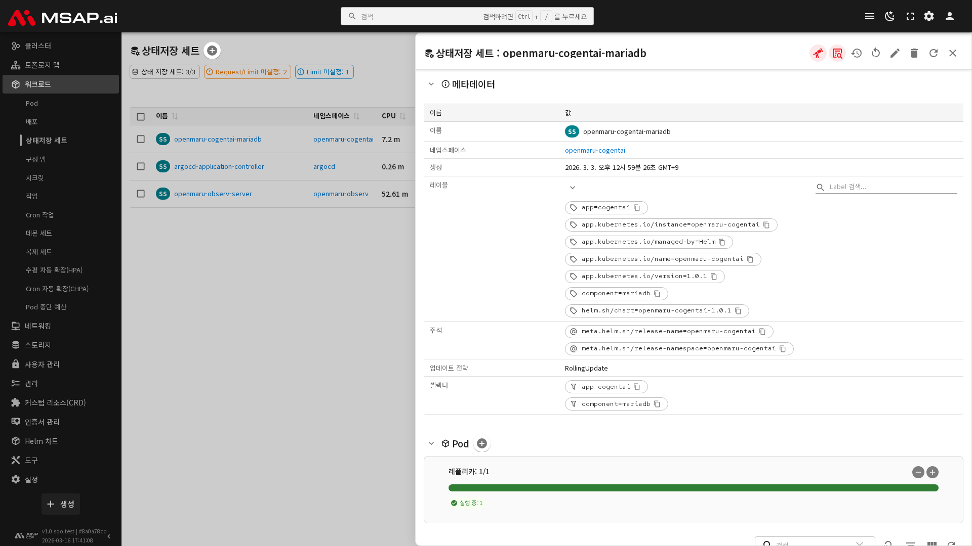 MSAP.ai 콘솔의 '상태저장 세트(StatefulSet)' 메뉴에서는 안정적인 네트워크 식별자와 영구 스토리지가 필요한 상태 저장 애플리케이션을 관리합니다. 데이터베이스, 메시지 큐 등 상태를 유지해야 하는 워크로드를 배포하고 모니터링할 수 있습니다.