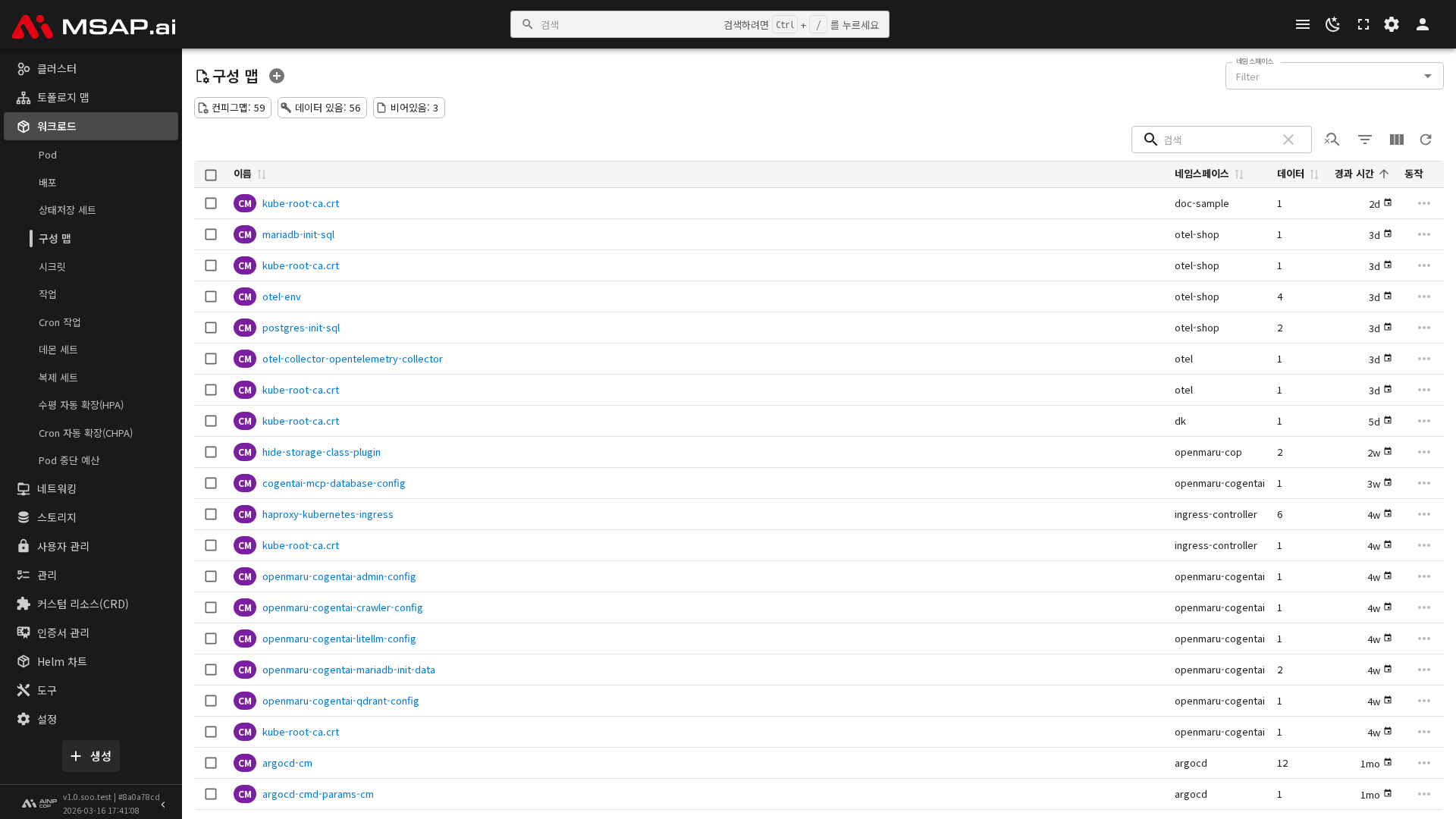 우측 상단의 검색창, 네임스페이스 필터를 사용하여 원하는 Config 맵을 효율적으로 찾을 수 있습니다.