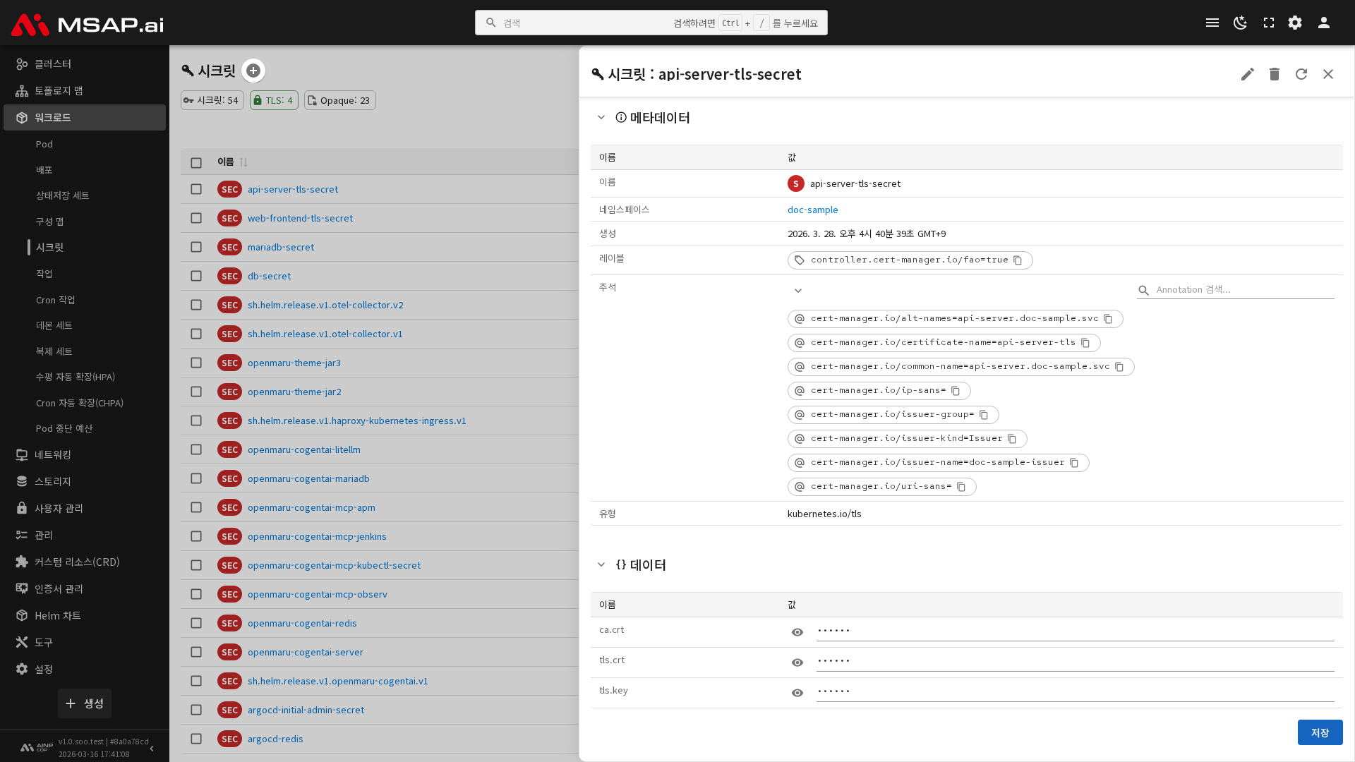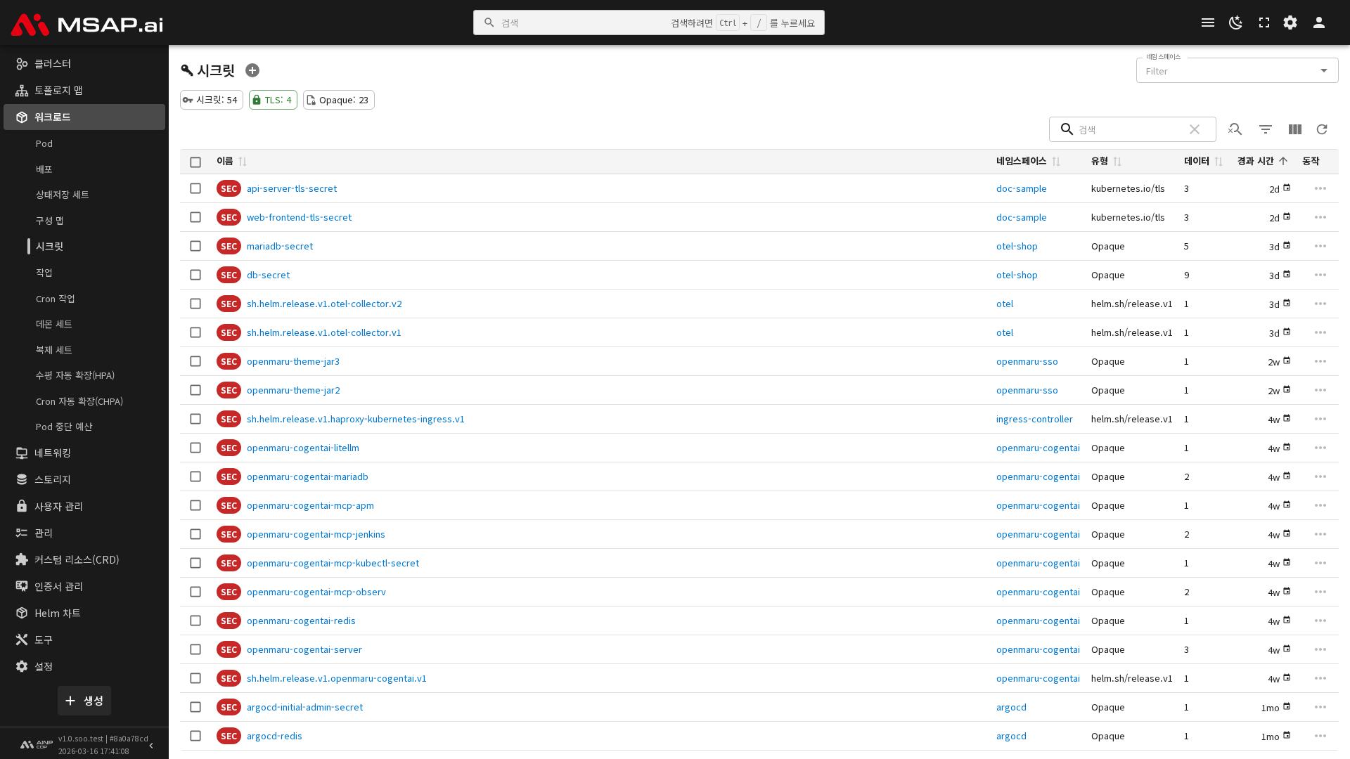 클러스터에 생성된 시크릿의 정보가 목록 형태로 표시됩니다.
