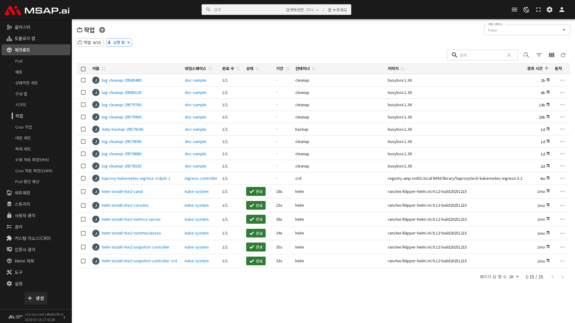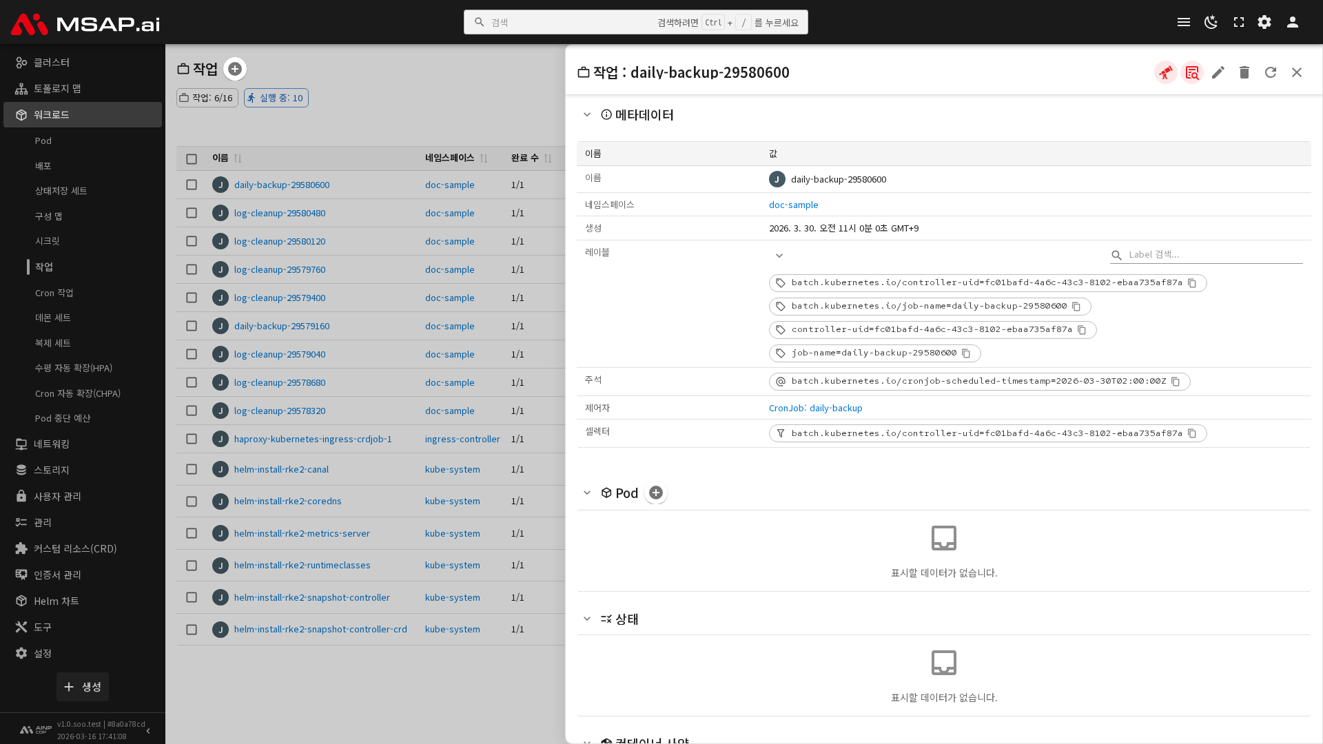 MSAP.ai 콘솔의 '작업(Job)' 메뉴에서는 하나 이상의 파드를 생성하여 지정된 수의 파드가 성공적으로 완료되도록 보장하는 워크로드를 관리합니다. 작업은 배치 처리, 데이터베이스 마이그레이션 등 한 번 실행되고 종료되는 태스크를 수행하는 데 유용합니다.