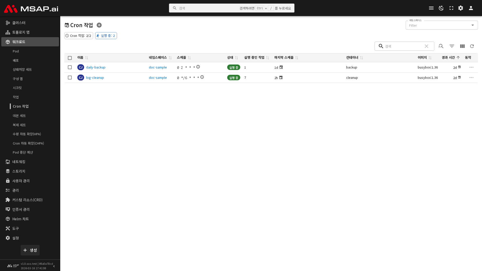클러스터에 설정된 Cron 작업의 정보가 목록 형태로 표시됩니다.