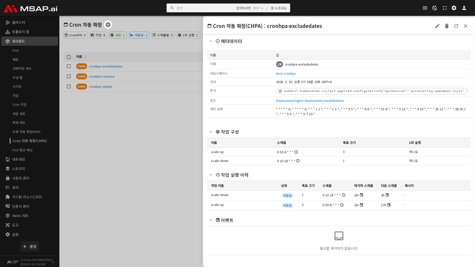CronHPA의 스케줄링 실행 기록과 관련 이벤트를 확인할 수 있습니다.