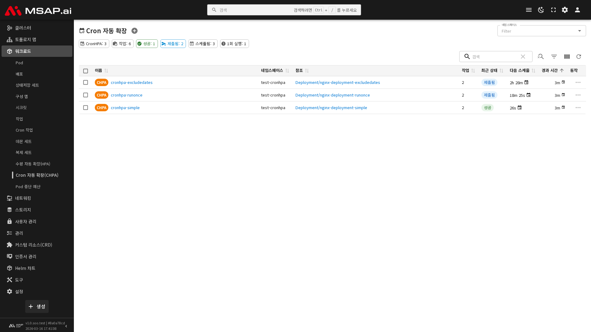MSAP.ai 콘솔의 'CronHPA(Cron Horizontal Pod Autoscaler)' 메뉴에서는 스케줄 기반으로 파드의 수를 자동 확장하는 설정을 관리합니다. HPA가 실시간 메트릭을 기반으로 스케일링하는 반면, CronHPA는 미리 정의된 시간 스케줄에 따라 파드 수를 조정합니다. 예측 가능한 트래픽 패턴이 있는 워크로드에 유용합니다.