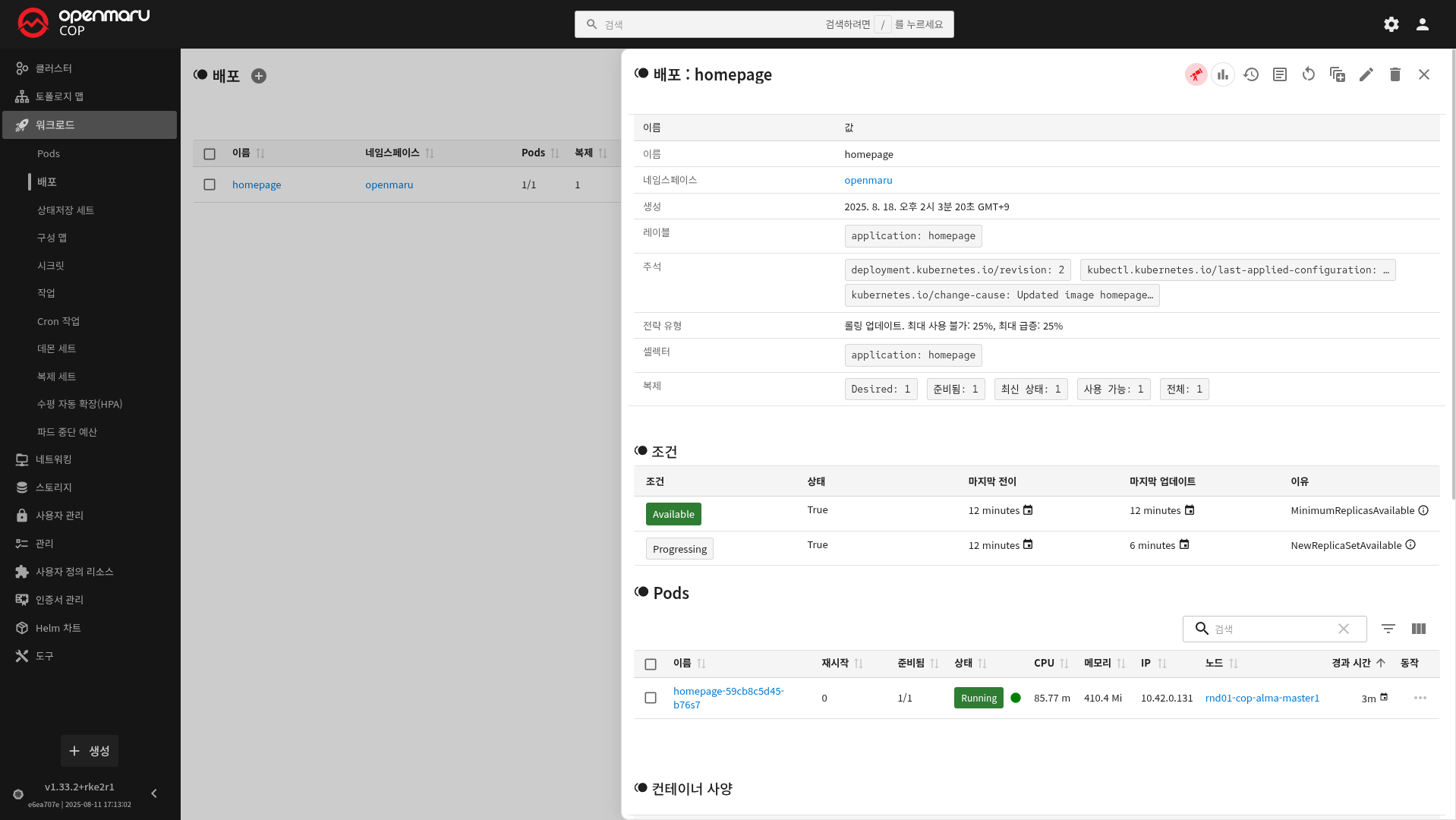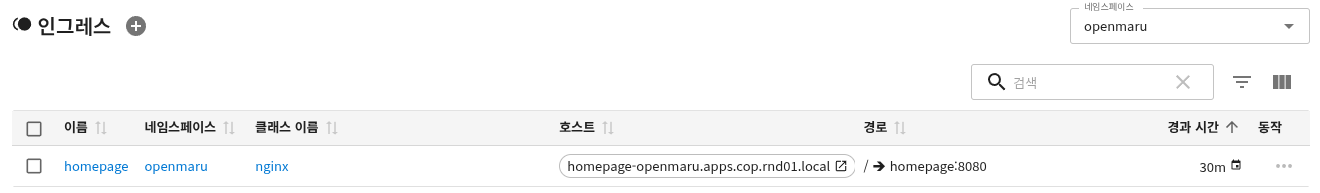 | HOST | Ingress 접속 URL | homepage-openmaru.apps.cop.rnd01.local |